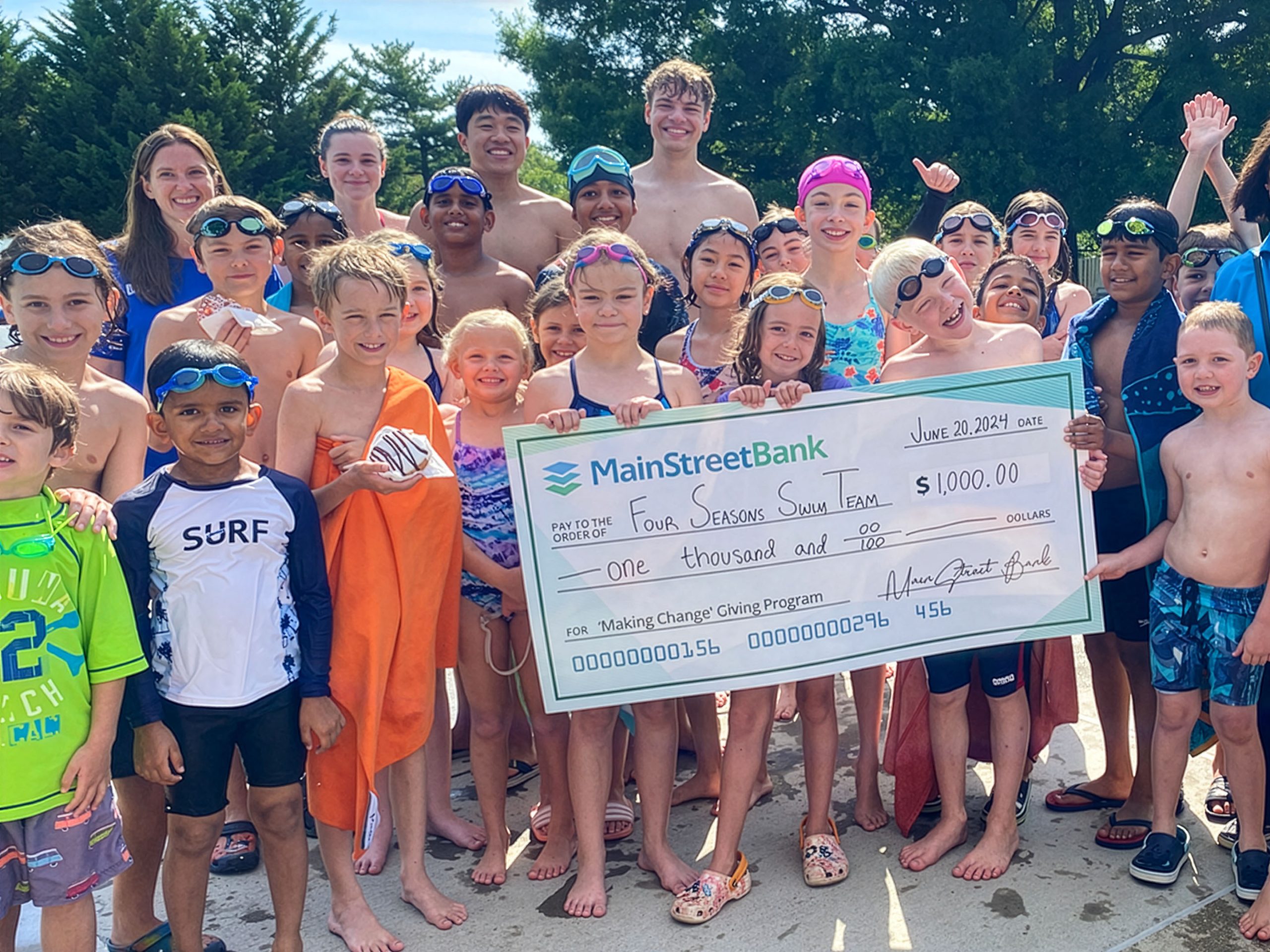 Above: The Four Seasons Swim Team receives a Making Change Donation. (Photo: MainStreet Bank)
