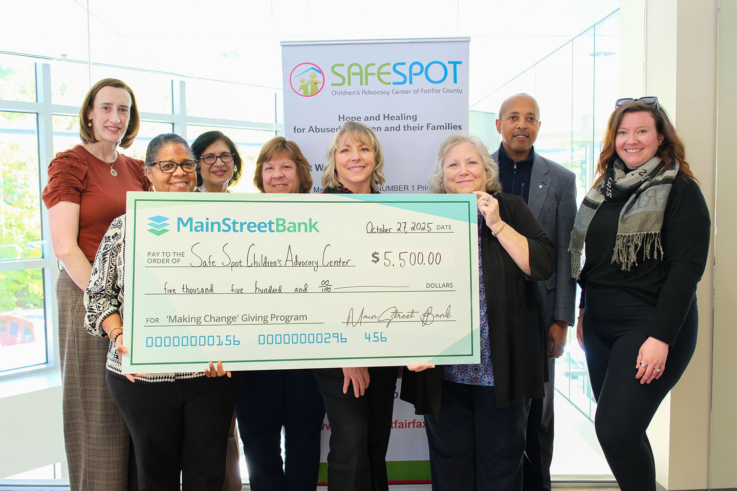 Inspired by SafeSpot’s critical work, a team of MainStreet Bank employees pooled their Making Change donation funds, contributing a total of $5,500 to support the organization.